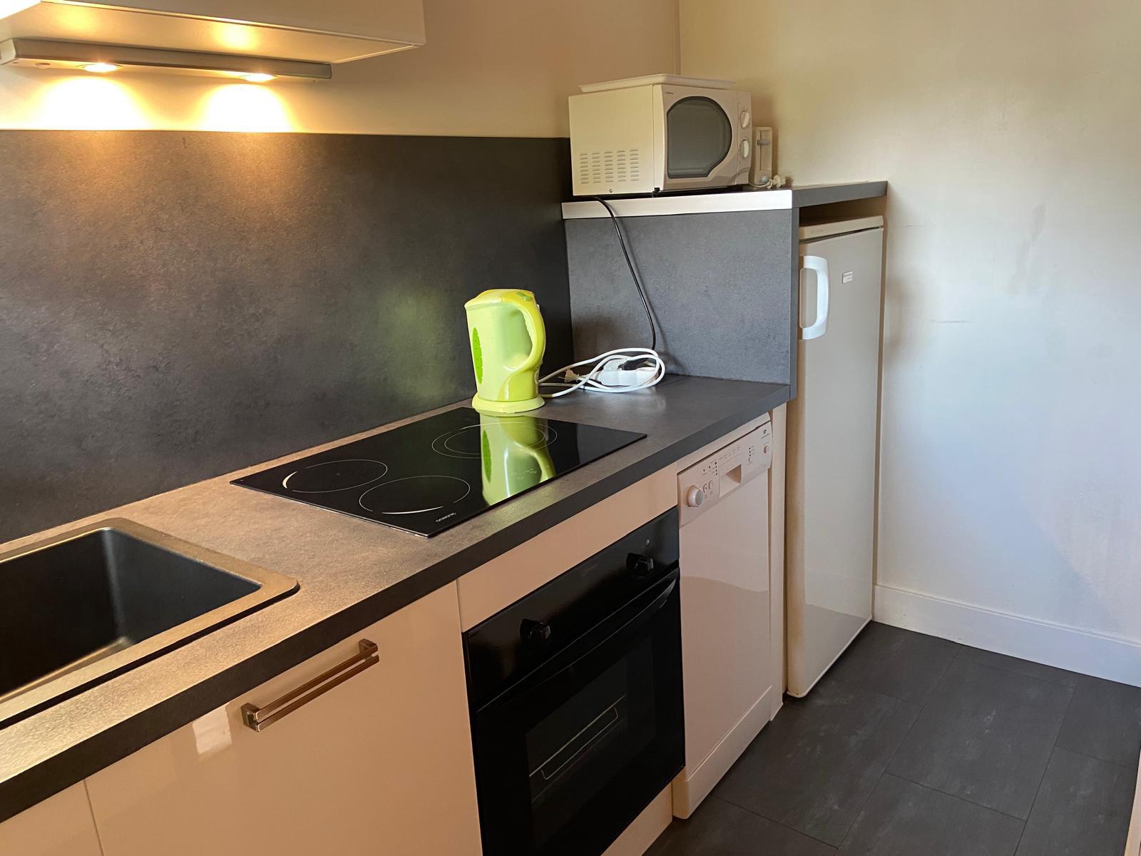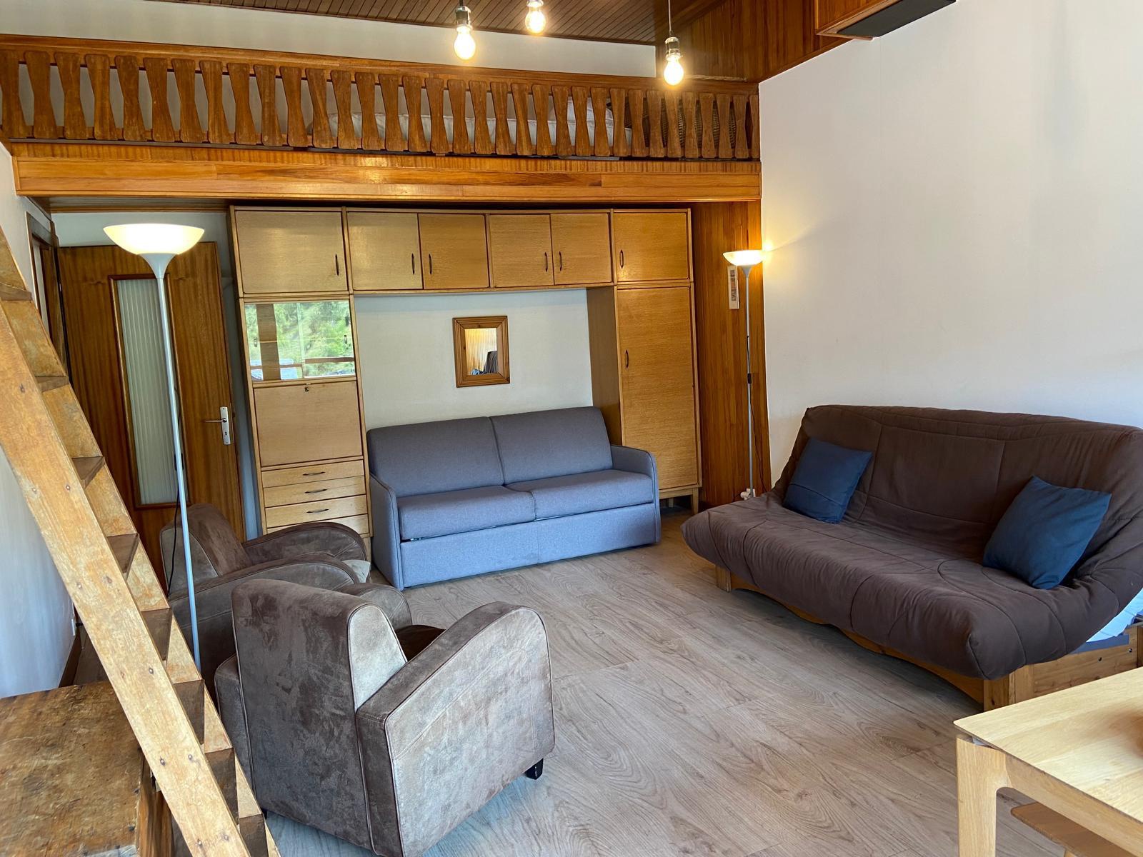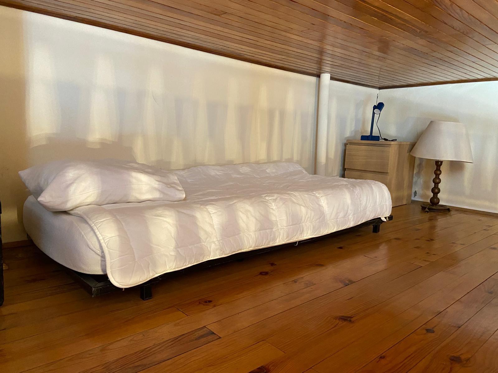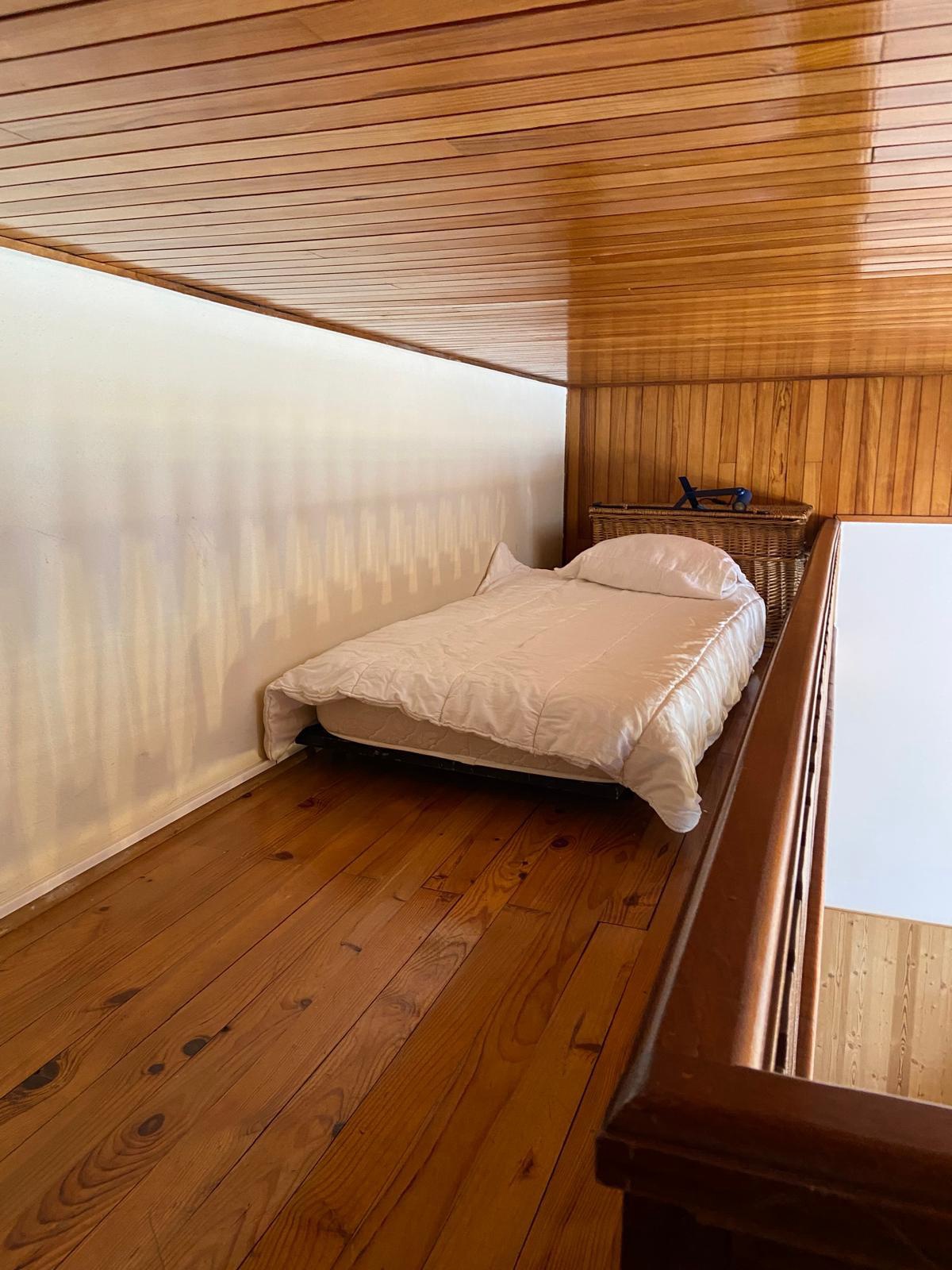 Comprising a living room with sofa bed (160 x190) and a mezzanine with 3 single beds, television and dining area. The kitchen area is fully equipped (oven, microwave, hob, dishwasher, etc.) and separate from the living area.