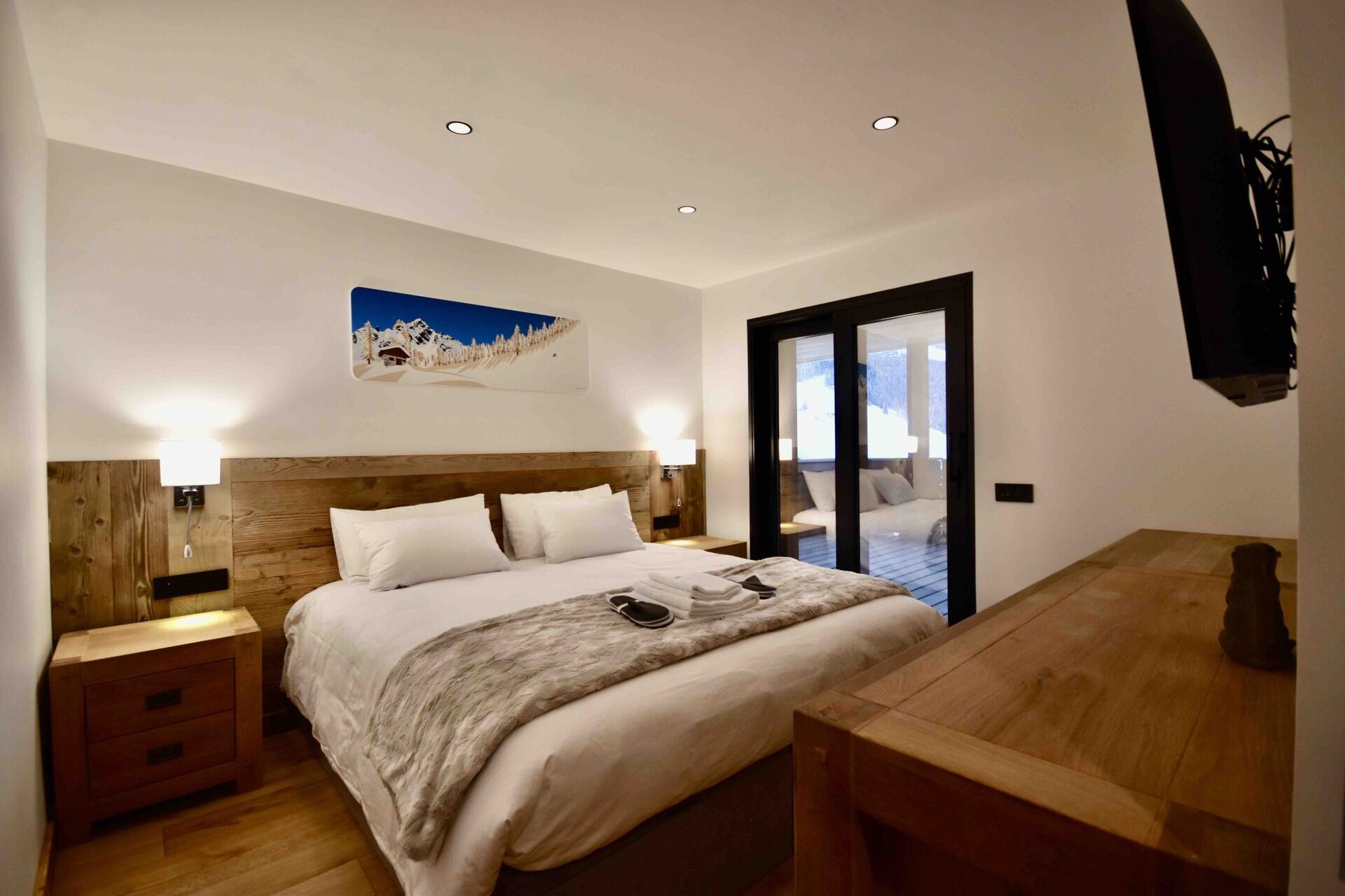 2 chambres double avec une literie de luxe King size 180 x 200 avec la possibilité de les mettre en 2 lits simple 90 x 200, placard et commode, TV 109 cm, une salle d’eau avec une douche à l’italienne et WC, une terrasse ou un balcon